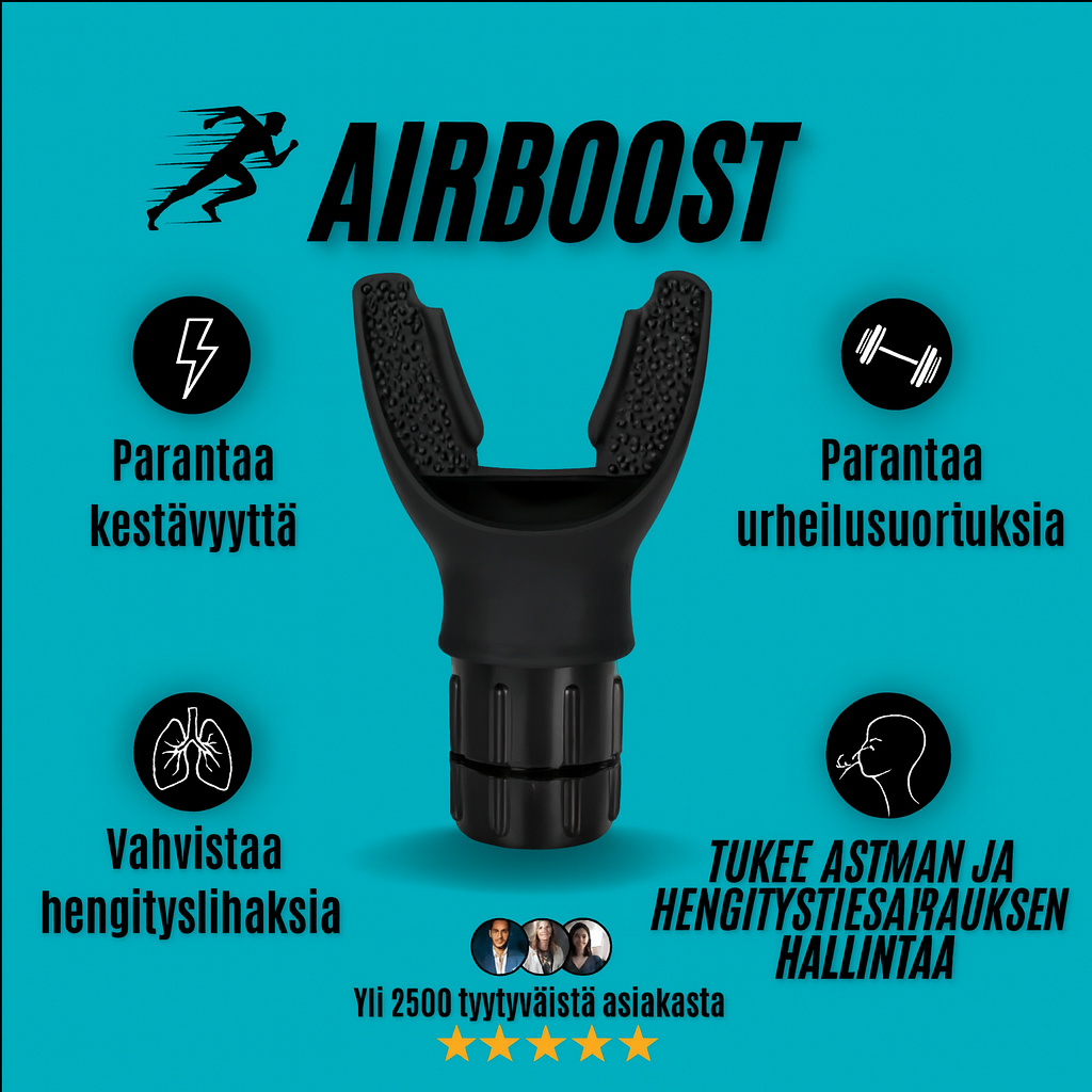 AirBoostin avulla jaksan treeneissä enemmän ja hengästyn vähemmän. Materiaali on kestävää ja hygieenistä – laadukas tuote, jota suosittelen.